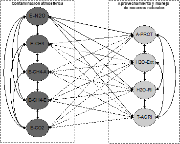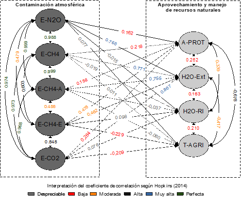 Como se observa en la figura 3, en el grupo de contaminación atmosférica se observan asociaciones moderadas (E-CH4-E con E-N2O y E-CH4-A), altas (E-CH4-E con E-CH4 y E-CO2) y perfectas (E-N2O con E-CH4, E-CH4-A y E-CO2; E-CH4 con E-CH4-A y E-CO2; E-CH4-A con E-CO2), siendo todas las asociaciones positivas por lo que se puede decir que en este caso los indicadores de contaminación atmosférica siguen una tendencia de asociación directa entre ellos.