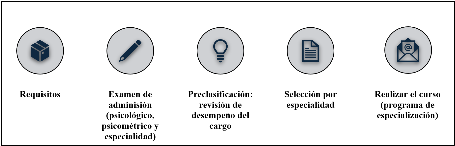 En la quinta fase, aprobación al programa. El candidato es informado de que comenzará el programa de especialización. Por lo tanto, los funcionarios seleccionados cumplen con requisitos estrictos antes de ser matriculados en los programas de capacitación, incluyendo la posesión de un título profesional, tal como lo exigen los requisitos legales para ser admitidos a la universidad. Además, por convenio o contrato, la DGI cubre el costo del estudio y se facilita el tiempo necesario para su formación, que va desde 18 meses, 2 años y hasta 4 para doctorandos.