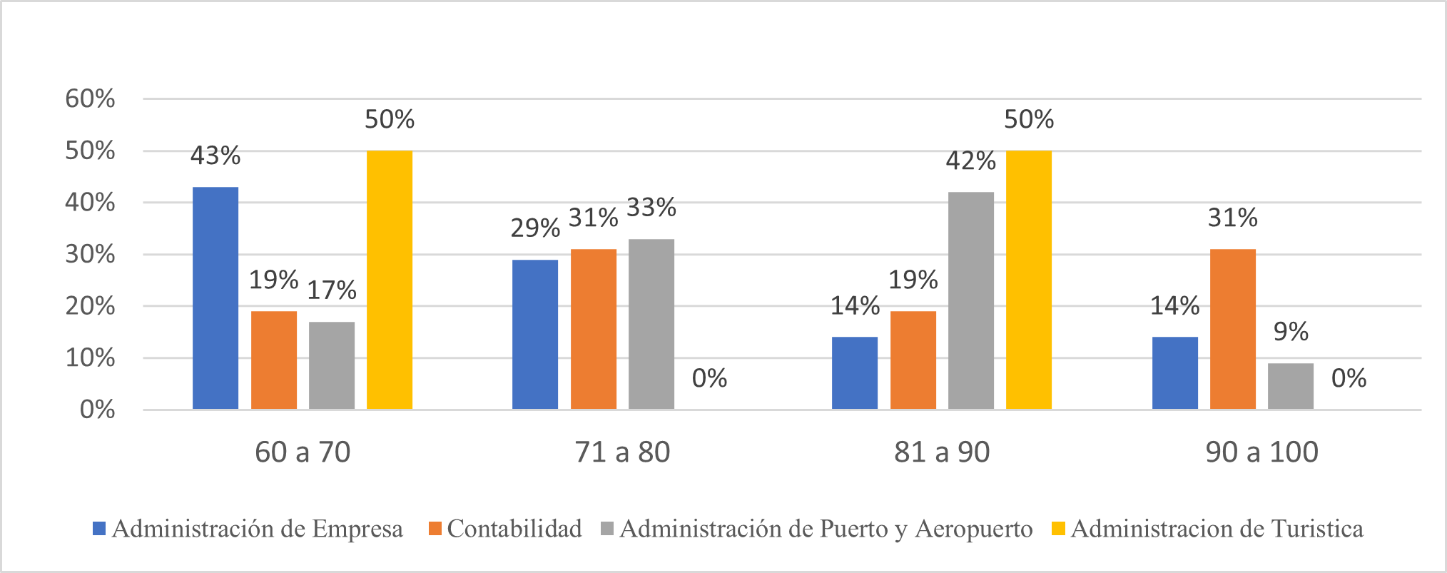 En la figura 1, evidencia que la carrera de Administración de Turística tiene una alta proporción de estudiantes en el rango más alto (90 a 100), destacando en comparación con las demás carreras, en contraste con la carrera de Administración de Empresa muestra una mayor concentración de estudiantes en el rango bajo (60 a 70), sin embargo las carreras de Contabilidad y Administración de Puerto y Aeropuerto tienen una distribución más equilibrada, aunque Contabilidad tiene un mayor porcentaje en rangos altos (90 a 100). La mayoría de los estudiantes presenta calificaciones en el rango de 60 a 80 puntos.