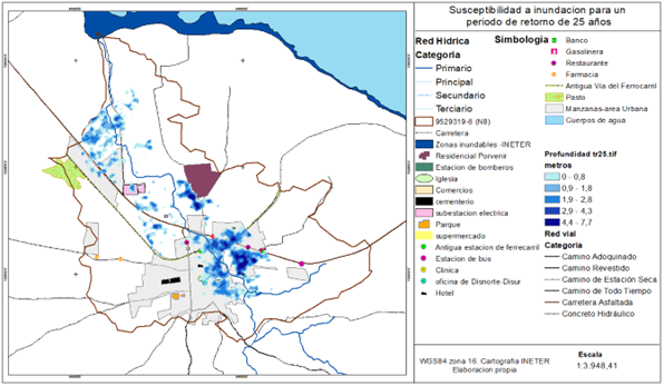 Nicaragua’s vulnerability to disasters was exposed with the passage of Hurricane Mitch in October 1998, which led the Nicaraguan State to establish in March 2000 a comprehensive system for Disaster Risk Reduction (DRR) called the “National System for Disaster Prevention, Mitigation and Response (SINAPRED) (IFRC, Disaster Risk Reduction). 2013, p. 5). The municipality of Nagarote is exposed to both natural and man-made threats; mainly associated with hydrometeorological phenomena. In a risk level classification carried out in 151 municipalities in Nicaragua, Nagarote ranks 14th, where position 1 represents the highest risk. The main threats in the area are drought, rated at the highest level, followed by the risk of floods and seismic activity (ENACAL, 2019, p.60). In addition, the lack of detailed mapping prevents the precise identification of the affected areas and the extent of the surface water surface. Against this background, this study carries out an analysis of flooding in the basin, with the aim of spatially identifying the most vulnerable areas and the level of the surface water surface. To this end, hydrological modelling was used using geographic information systems and the HEC-GeoRAS tool, simulating scenarios for return periods of 10 and 25 years. The main results indicate that the areas with the highest exposure to flooding correspond to the most populated areas of the municipality. Similarly, most of the dry river is unable to channel the waters, which causes flooding on both banks of the river where water velocities range from 01 to 39 m/s, while the surface water varies between 1 and 3 meters in height in some areas of the watershed. That is why the identification of flood zones in the event of an extreme event is of great importance in territorial planning and risk management, especially in highly exposed municipalities in Nicaragua.