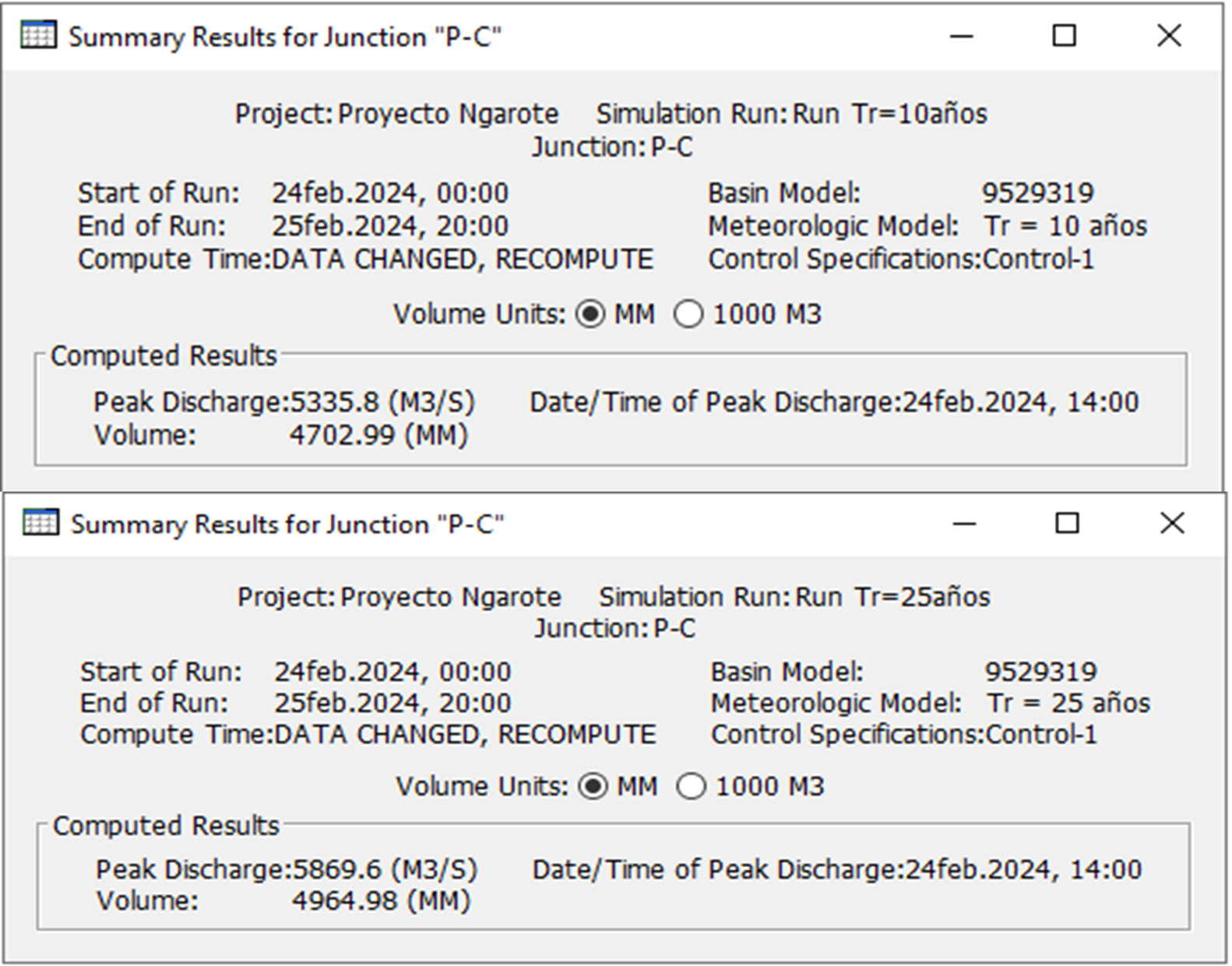 En la tabla 2, se muestran los caudales calculados para los periodos de retorno estudiados. Se observa que el caudal proyectado para tr (tiempo de retorno) de 10 años es equivalente a 5335.8 m3/s para un evento extremo; para 25 años se espera que ese caudal aumente a 5869.9 m3/s. Es evidente que, a medida que aumenta el periodo de retorno, también aumenta la intensidad del evento y en consecuencia el volumen de agua transitada.