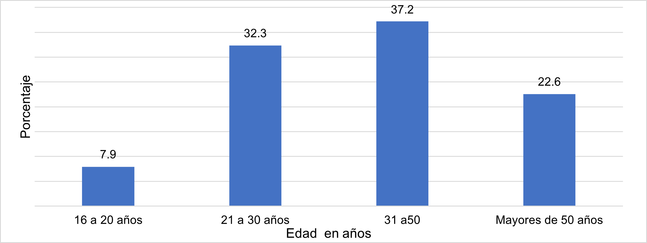 Las edades de los participantes en la muestra (n = 325) se agruparon en los siguientes rangos: 16 a 20 años (9.2%), 21 a 30 años (31.7%), 31 a 50 años (36.6%) y mayores de 50 años (22.5%). El grupo predominante en el estudio fue el de 31 a 50 años, seguido por el de 21 a 30 años. El 22.5% de los participantes tenían más de 50 años, siendo en su mayoría pensionados, quienes presentan una mayor demanda de asistencia médica. Estos resultados son similares a los reportados en las publicaciones revisadas, donde el sexo femenino fue el más frecuente en la muestra, y el grupo etario más común fue el de 50 a 59 años (Sequeira, 2019).