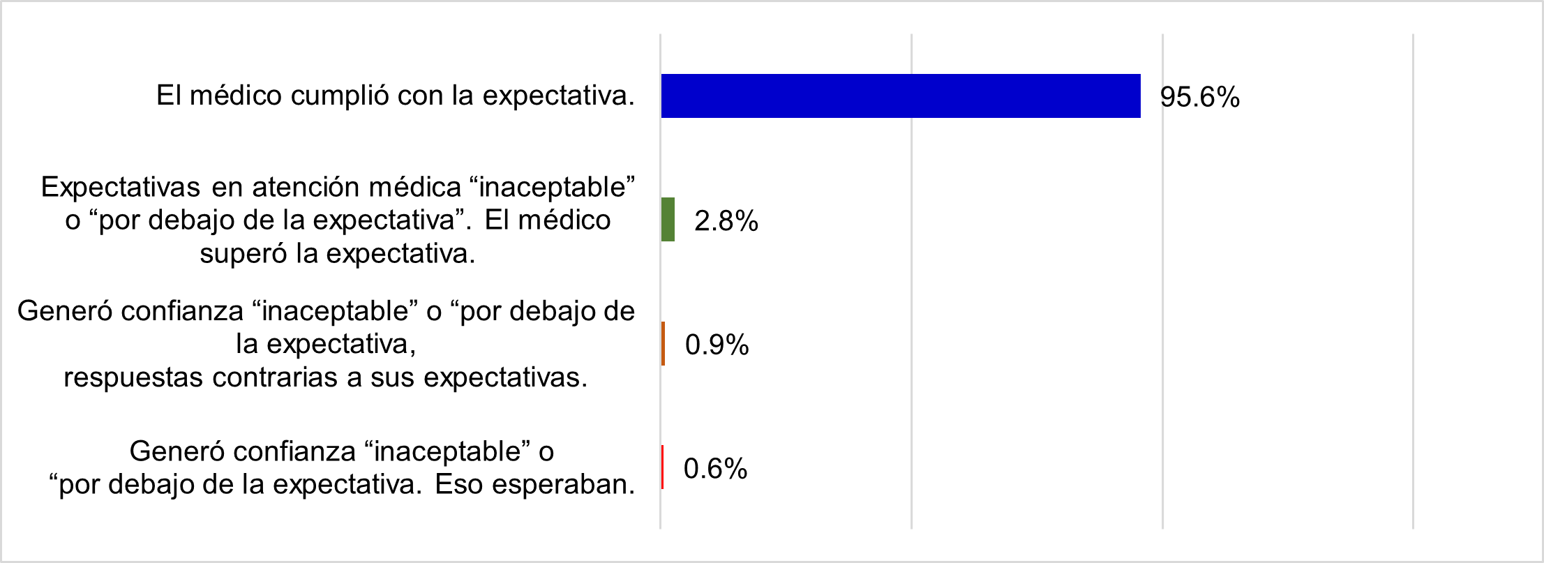 En la figura 5, el 95.6% de los encuestados, manifestaron que el médico cumplió con la expectativa que tenían, la superó o fue sobresaliente con la generación de confianza al realizar la atención, El 2.8% cuyas expectativas era una atención médica “inaceptable” o “por debajo de la expectativa”, refirió que el médico cumplió con la expectativa, la superó o fue sobresaliente al generar la confianza debida.