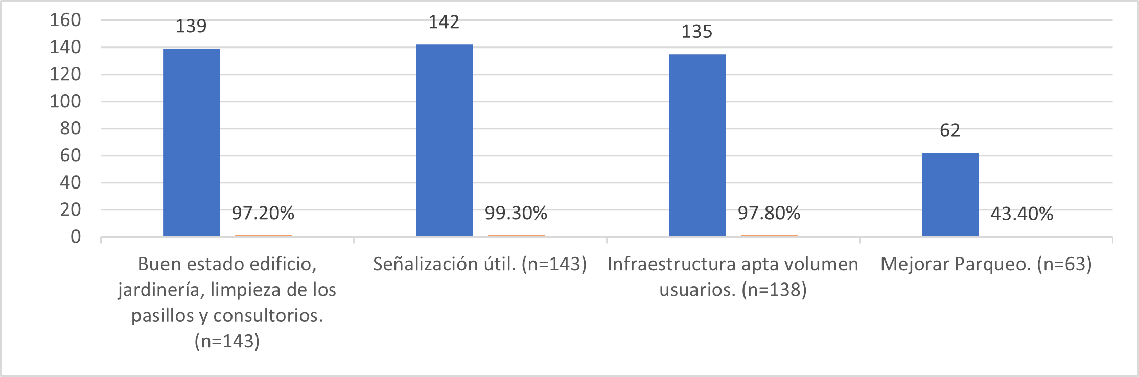 El 97.2% (n= 139) refirió que las condiciones físicas, relacionada al buen estado edificio, la jardinería, la limpieza de los pasillos y de los consultorios, cumplen con las expectativas, las supera o es sobresaliente. El 99.3% (n=142), considera que la señalización es útil, que la infraestructura es apta para albergar el volumen de usuarios de la Policlínica Tipitapa (97.8%, n=135) y el 43.4% (n=63).de los usuarios considera se debe mejorar el parqueo.