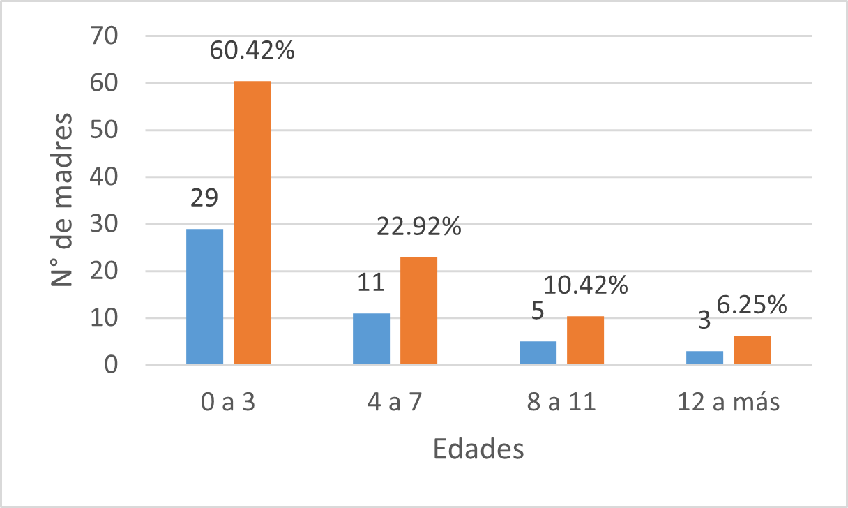 Considerando a Sánchez Vera (1997), que define la edad cronológica como la edad en años, que va desde el nacimiento hasta la edad actual de las personas, en la figura 2 se demuestra que los hijos de estas estudiantes universitarias en su mayoría están en edades que necesitan la compañía y supervisión de un adulto, el 60.42% apenas tiene entre 0 y 03 años, etapa donde el niño es totalmente dependiente de su madre. El porcentaje restante corresponde a niños que aún no han alcanzado los 12 años, lo que significa que la totalidad de los hijos de las madres participantes requiere atención significativa, dado que transitan por las etapas de preescolar y primaria, periodos formativos fundamentales para el desarrollo de habilidades sociales, emocionales y académicas.