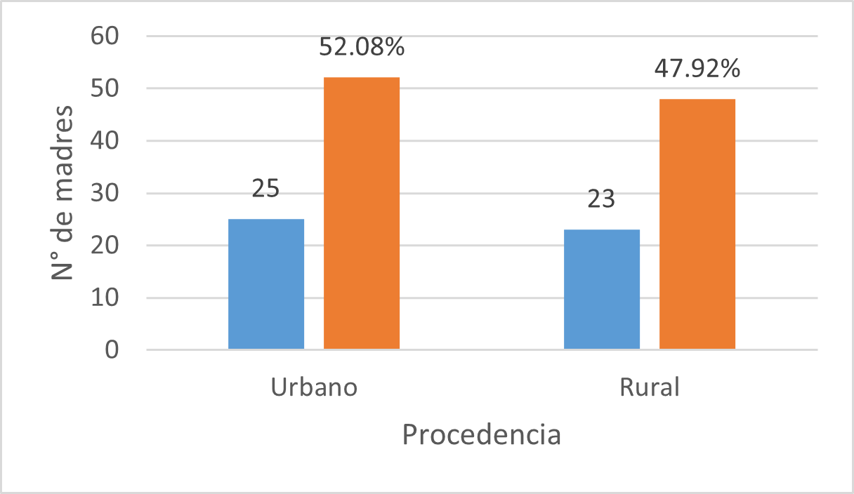 La figura 5 muestra el lugar de procedencia de las madres. Del total de encuestadas el 52.08% que corresponde a 25 mujeres proceden del casco urbano, mientras que 23 mujeres que corresponde al 47.92% proceden de la zona rural. Este dato se vuelve relevante si se considera que las condiciones y necesidades de ambos grupos son diferentes, por tanto, las estrategias de atención deben ser diferenciadas y contextualizadas. En el caso de las madres provenientes de zonas rurales, es probable que enfrenten barreras adicionales relacionadas con el acceso limitado a medios de transporte público, la escasa disponibilidad de servicios básicos y la menor presencia de redes de apoyo formales e informales. Estas condiciones pueden incrementar el nivel de dificultad para asistir regularmente a clases, participar en actividades académicas extracurriculares o acceder a recursos tecnológicos indispensables para el desarrollo de las tareas universitarias.