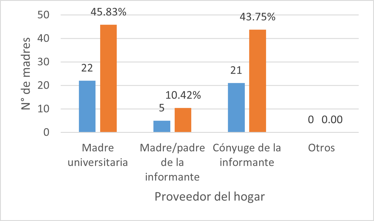Estos datos son significativos, evidenciando que las madres universitarias no sólo asumen las exigencias propias de la maternidad y la de estudiantes universitarias, sino también la responsabilidad de generar ingresos para sostener su hogar, lo que conlleva una sobrecarga de roles, provocando altos niveles de estrés, agotamiento físico y emocional y por ende dificultades para mantener su rendimiento académico. Por otro lado, el 43.75 % de las encuestadas que cuentan con un cónyuge como proveedor económico puede experimentar una situación relativamente distinta, con menos presión financiera lo que le permitiría mayor concentración en sus estudios.