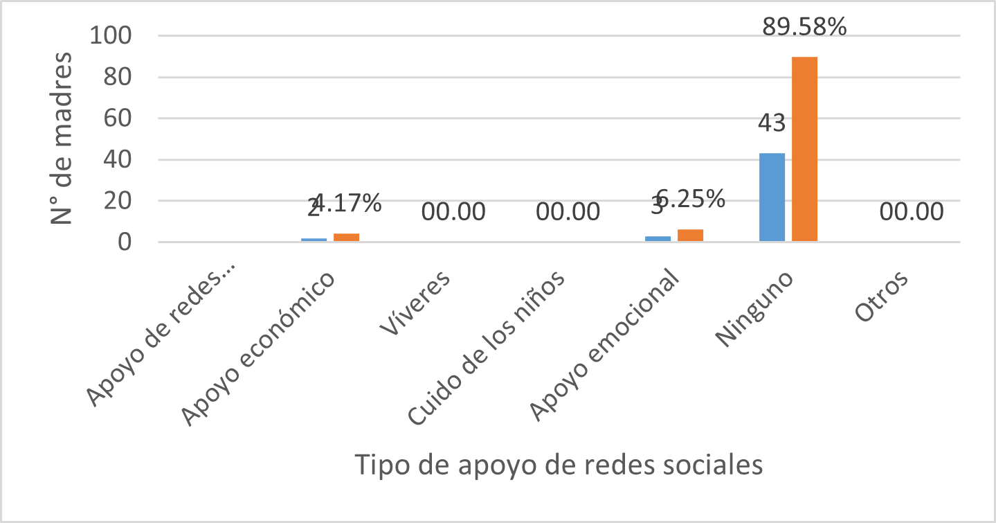 El 89.58% de las madres universitarias no reciben ningún apoyo de las redes sociales con las que cuenta, esto supone que entonces no han construido relaciones sólidas que se conviertan en sus redes de apoyo. Esta falta de redes sociales de apoyo refleja cierto aislamiento social lo que implica a la vez aumento en la carga emocional.