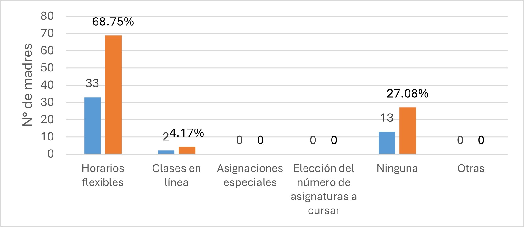 Sin embargo, al contrastar esta información con los hallazgos cualitativos obtenidos en entrevistas a autoridades y docentes, donde se les planteó la misma interrogante, se confirma que la flexibilidad horaria no es parte de una política institucional específica dirigida a madres universitarias, sino más bien una oferta general pensada para toda la comunidad estudiantil.