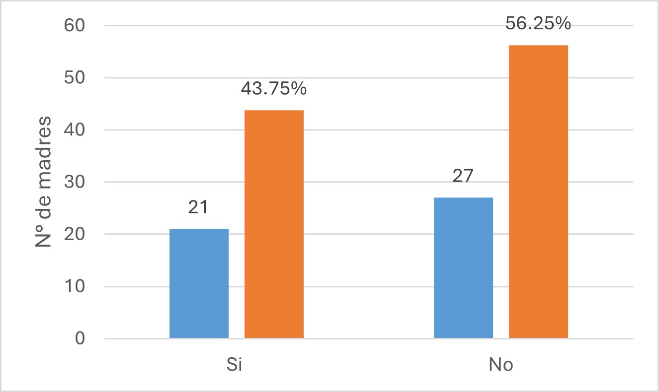 Solo una de las madres participantes afirmó compartir de manera equitativa las responsabilidades de crianza y del hogar con su pareja, mientras que las otras once expresaron que el apoyo recibido por parte de los padres de sus hijos se limita únicamente a lo económico, sin que exista una participación en las labores cotidianas ni en el cuido directo de los menores.