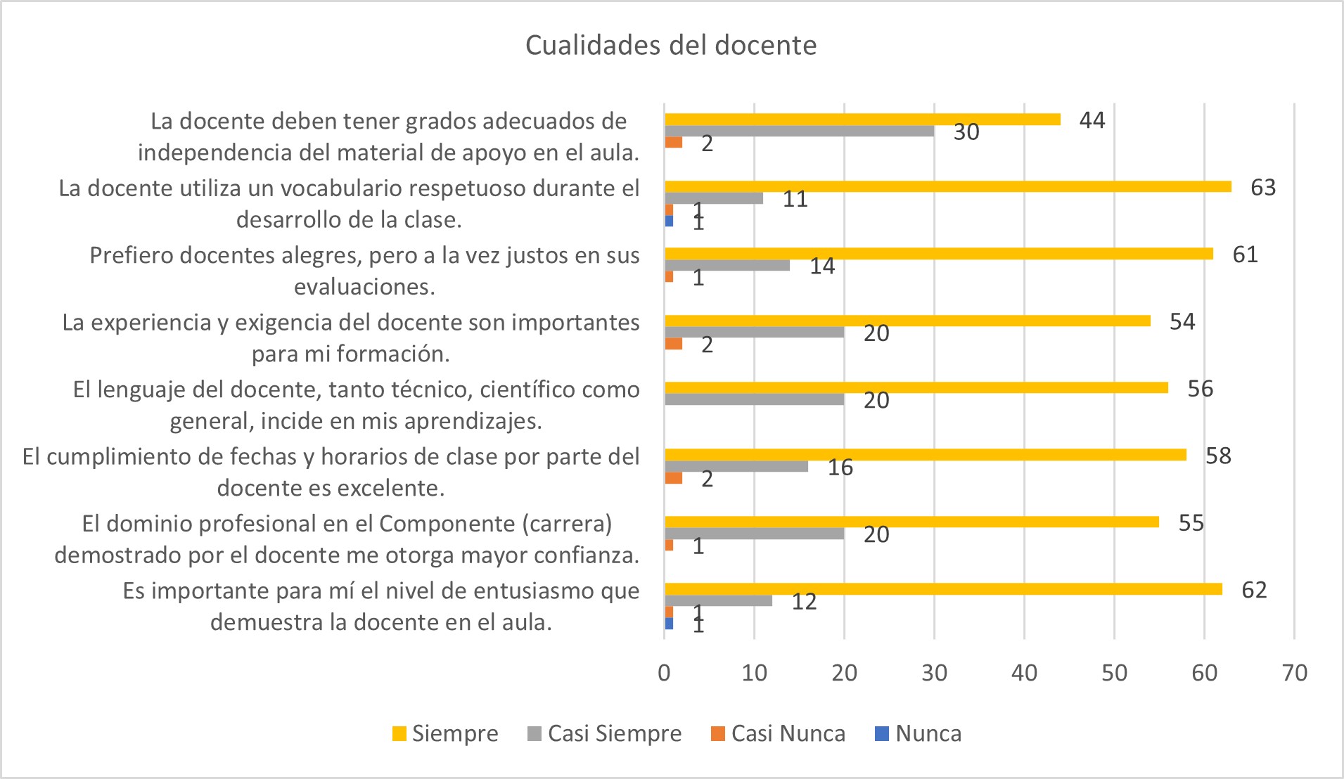 Estos resultados, fundamentan que más allá del dominio científico, técnico y metodológico, las cualidades personales del docente tienen un fuerte impacto en el proceso formativo del estudiantado y por ende en el rendimiento académico del mismo.