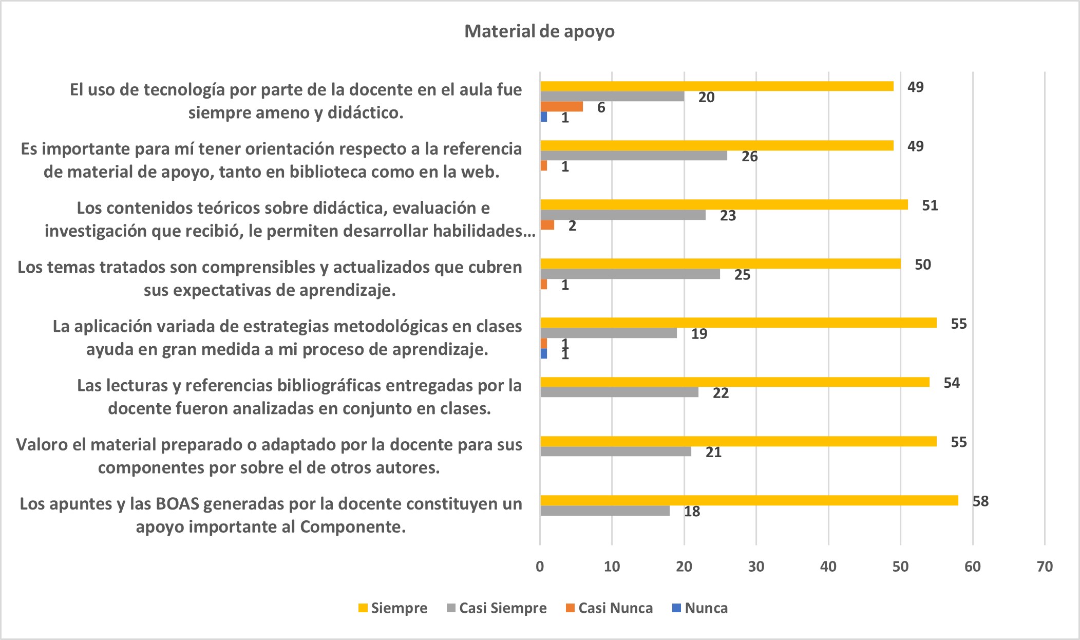 Los resultados de esta categoría evidencian que el estudiantado no solo valora las BOA y otros recursos adaptados por los docentes, sino que también valoran el compromiso, dedicación y el sentido didáctico que estos reflejan. Esta percepción positiva fortalece las cualidades del docente como facilitador de aprendizaje desde la selección, planificación, diseño, construcción y aplicación de los contenidos en contextos reales.