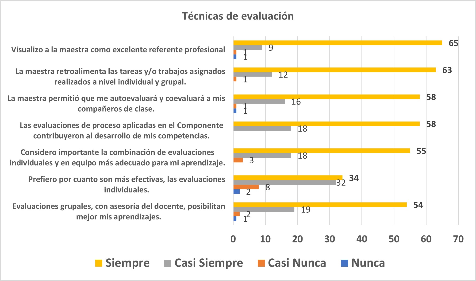 Estas prácticas antes mencionadas, son consistentes con lo indicado por Parra Roldán et al. (2024), Posso Pacheco et al. (2023) y Flores Morán (2019) quienes evidencian que la participación activa en la evaluación favorece la autonomía del estudiantado, además del acompañamiento cercano del docente, dentro y fuera del aula contribuye a facilitar aprendizajes significativos y contextualizados a nivel personal como colectivos.