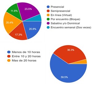 Las modalidades en orden descendente de las encuestas fueron: Sabatino y/o Dominical, Presencial, En línea (Virtual), Semipresencial, Por encuentro y encuentro semanal, todas las modalidades prefirieron encuentros de menos de 10 horas clases.