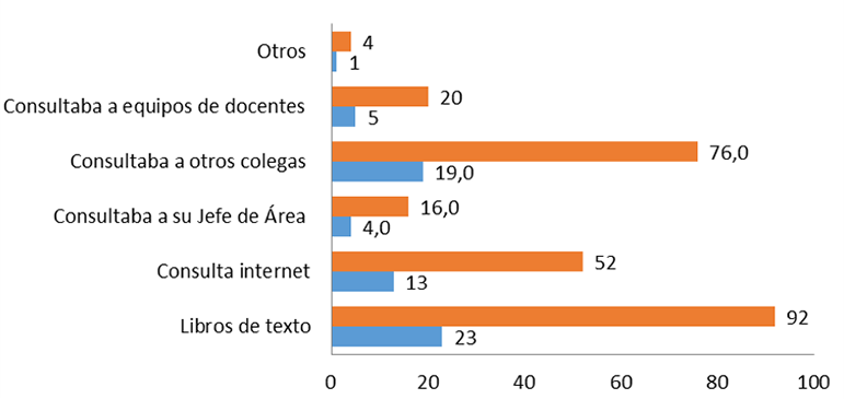 En esta pregunta llamó mucho la atención que la herramienta de aprendizaje más utilizada por los docentes era el libro de texto. Puesto que así lo expresó el 92% del profesorado consultado en la encuesta aplicada (figura 1). Respecto a la manera de preparación de sus clases, destaca la consulta a otros colegas con un 76% de docentes que respondieron a esta pregunta. Respecto a esta pregunta, el docente del Instituto Fernando Salazar en el grupo focal opinó que a él le “orientaron otros maestros con experiencia cómo enseñar Ciencias Sociales”.