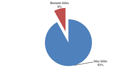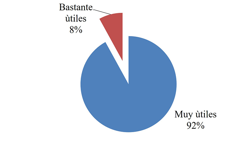 Por otra parte, respecto a los contenidos abordados en la asignatura DCS, obtuvieron una valoración muy positiva, puesto que el 92% de los docentes los consideran muy útiles. De esto se deduce que la metodología didáctica aplicada en la asignatura y la metodología implementada por el docente llena las expectativas de los docentes que cursaron la asignatura.