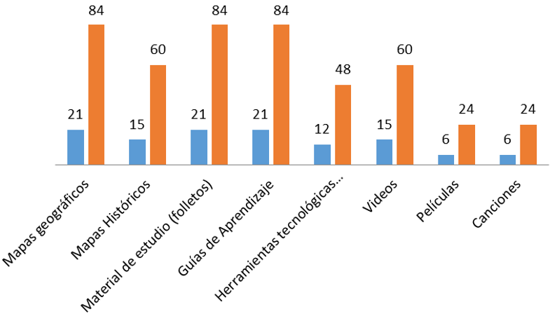 Respecto a los medios didácticos el 84% de los docentes expresó que frecuentemente utilizan mapas geográficos, folletos y libros, guías de autoaprendizaje y solo el 60% expresó que utilizan mapas históricos y videos.