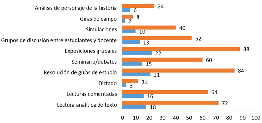 De acuerdo a la encuesta aplicada a los docentes la estrategia didáctica que más utilizan son las exposiciones grupales (88%) y el 84% práctica con mucha frecuencia la resolución de guías de estudios. En párrafos anteriores vimos la opinión que tiene mayoría del estudiantado, tanto de la resolución de las guías de estudio como de las exposiciones que realizan. Los estudiantes expresaron en el grupo focal que al momento de hacer las exposiciones los equipos son de hasta siete integrantes, y que cada uno toma una parte del tema de la exposición, se preparan por su cuenta y que al momento de hacer la exposición cada uno expone la parte que le correspondió.
