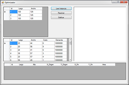 También se muestran los anchos y largos de cada uno de los posibles cortes, junto a su costo y demanda de cada pieza, así como las coordenadas de ubicación de las piezas que optimizan la solución.