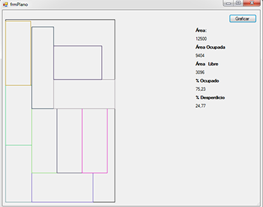 Al hacer clic en graficar, se abre una ventana con un botón graficar, al hacer clic nos mostrará la posible ubicación de las piezas dentro del tablero. Además se muestra el área ocupada, el área libre, el porcentaje ocupado y el porcentaje de desperdicio.
