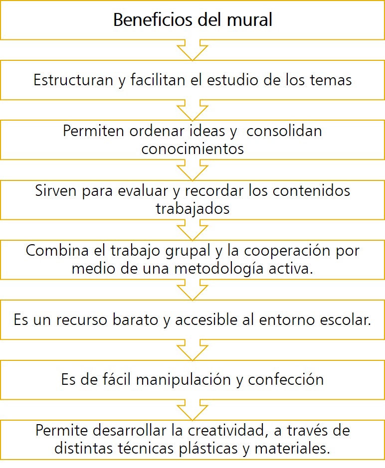 De lo anterior se confirma que el mural tiene muchos beneficios: estructura y facilita el estudio de los temas, permite ordenar ideas y consolidan los conocimientos de los estudiantes, combina el trabajo grupal y la cooperación por medio de una metodología activa, permite desarrollar la creatividad y sirve para evaluar los aprendizajes construidos.