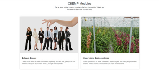 Con lo anterior, se procedió a desarrollar la página de inicio, la cual cuenta con un banner de encabezado (Ver Fig. 2 A) y arriba de este se encuentra con una barra de navegación (Ver Fig. 2 B), que como en toda página es el menú principal. En el cuerpo de la página se puede visualizar los dos módulos externos a la plataforma, el observatorio socioeconómico y la bolsa de empleo, estos no son más que enlaces directos a las dos aplicaciones web desarrolladas por los otros dos equipos de desarrollo del CIIEMP.(Ver Fig. 3)