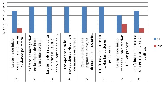 Un aspectos que se tomó en cuenta en la rúbrica fue la página de inicio, ya que es de mucha importancia, por ser lo primero que ven los usuarios al ingresar al sitio. En ella, se tomaron en cuenta los siguientes elementos:
