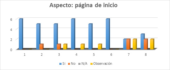 El primer gráfico representa los elementos evaluados en la página de inicio, obteniendo en la mayor parte respuestas positivas, y algunas observaciones como la incorporación de un lema en el que se describa el contexto de la aplicación y mejoras en las imágenes e íconos. (Ver ilustración 2)