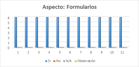 El tercer gráfico representa los elementos evaluados en cuanto a formularios, en lo cual se visualiza que se recibieron respuestas positivas en su totalidad, por lo tanto, no hubo observaciones. (Ver ilustración 4)
