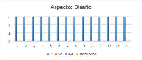 El cuarto gráfico representa elementos evaluados en cuanto a diseño, en lo cual se obtuvo la mayor parte respuestas positivas, y algunas observaciones como: uniformar colores, estandarizar estilos de botones. (Ver ilustración 5)