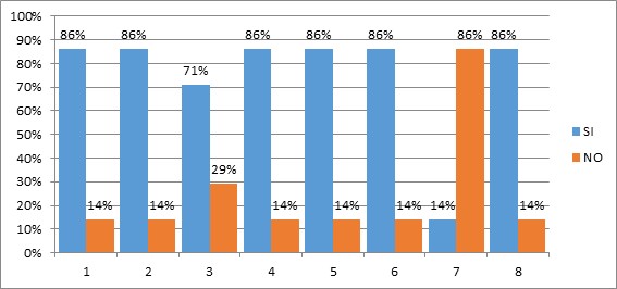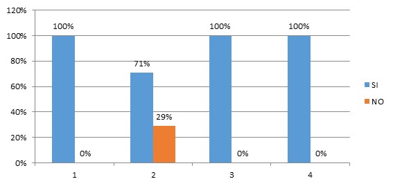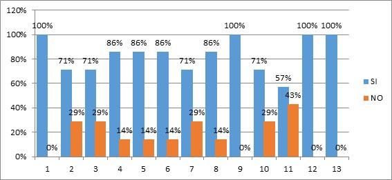 En los siguientes gráficos se muestran los aspectos que fueron evaluados donde a cada elemento se le incorpora en porcentaje lo observado por los evaluadores, SÍ para indicar que se cumple, NO en el caso que no cumple.