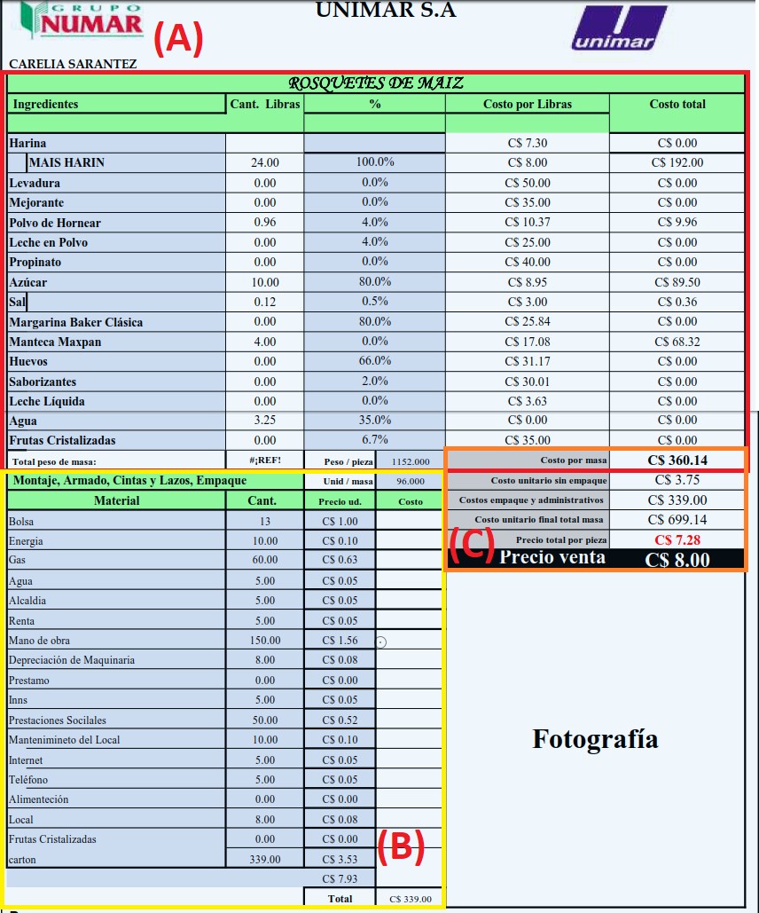 En cuanto a las fórmulas utilizadas, estas se dividen en dos secciones, la primera con una serie de ingredientes lo es la materia prima y su cantidad necesaria para la fabricación por arroba de pan. Al usar esta parte de la fórmula se obtienen los costos directos de fabricación. La segunda sección de una fórmula incluye los costos de empaque y administrativos (luz, agua, internet, mano de obra), estos costos deben ser actualizados periódicamente y cada vez que esto ocurre, deben actualizar cada uno de los registros de fórmulas en Excel.