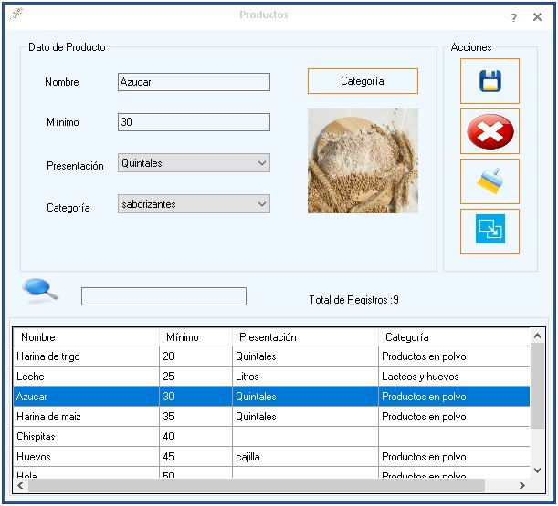 Formando parte del módulo de inventario, este formulario pretende ayudar al usuario a mantener un registro puntual de sus productos incluyendo: nombre, el mínimo permitido en el inventario; opcionalmente puede registrar la presentación del producto y una categoría para clasificarlo.