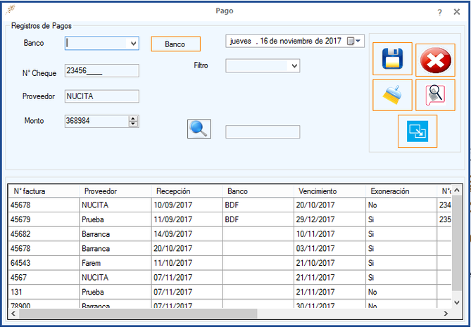 Este formulario se puede observar una lista de las entradas registradas, así mismo se pueden registrar pagos para las que estén en deuda y actualizar sus registros. El formulario dispone de opciones para seleccionar una o varias entradas sin pagar y registrar el pago de las mismas con el mismo número de cheque (si están adjudicadas al mismo proveedor). El cálculo del monto a pagar se realiza automáticamente según las selecciones del usuario y esta información posteriormente es utilizada en la generación de informes imprimibles.