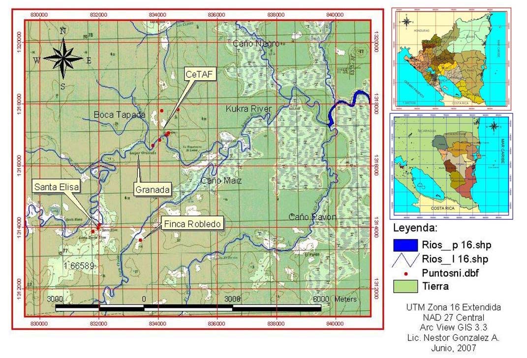 En total se trabajó con 50 productores que aprovechan la corteza del árbol y con 20 mujeres que aprovechan los derivados de la semilla, todos ellos vecinos aledaños a CeTAF, el cual se encuentra localizado a 22 km al suroeste de la ciudad de Bluefields entre las coordenadas (N 11º 53' 50,4" y W 083º 55' 53,9“).