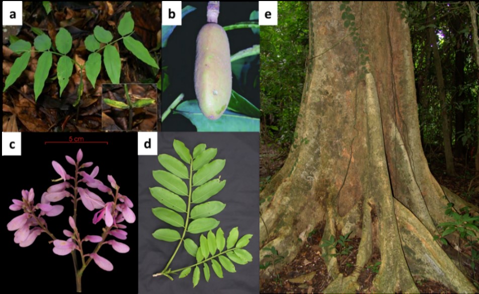 Figura 1. Imágenes de las Características taxonómicas de la planta. Plántula (a), fruto (b), flores (c), hojas (d) y el tronco (e).