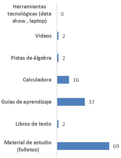 Cuando se les consultó sobre los principales recursos didácticos utilizados por los docentes en el aula de clases al facilitar los contenidos de la unidad de Álgebra correspondientes, respondieron que “en la unidad de Álgebra más que todo las guías de ejercicios que llevan los docentes, tarjetas, papelógrafo, la calculadora en menor medida, folletos”.