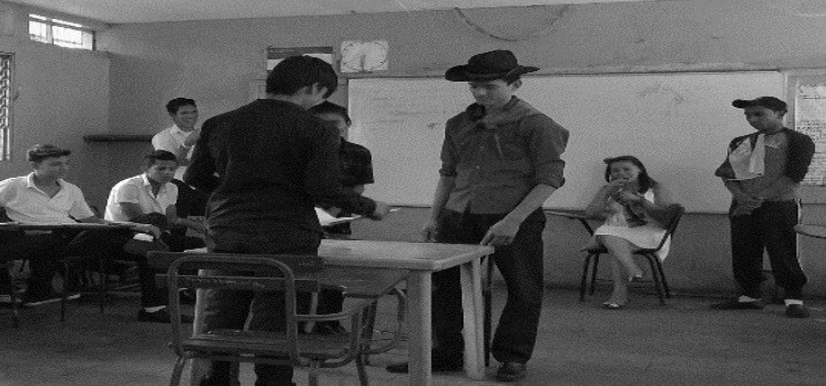 En la Figura 4 se representa una simulación del contenido Lucha de Sandino, la cual evidenció procesos empáticos por parte de los estudiantes de 7mo grado en la asignatura Historia. La simulación propició que los estudiantes se apropiaran del contenido –el cual fue estudiado previamente- al movilizar a una escena conceptos y criterios personales relacionados con el contenido. La actividad de aprendizaje culminó con un conversatorio en donde los estudiantes expresaron sus compresiones y valoración de esta estrategia didáctica para el aprendizaje de la Historia; también cabe destacar que la simulación realizada tomó en cuenta los procedimientos que se plantea en la Antología del MINED (2009b):