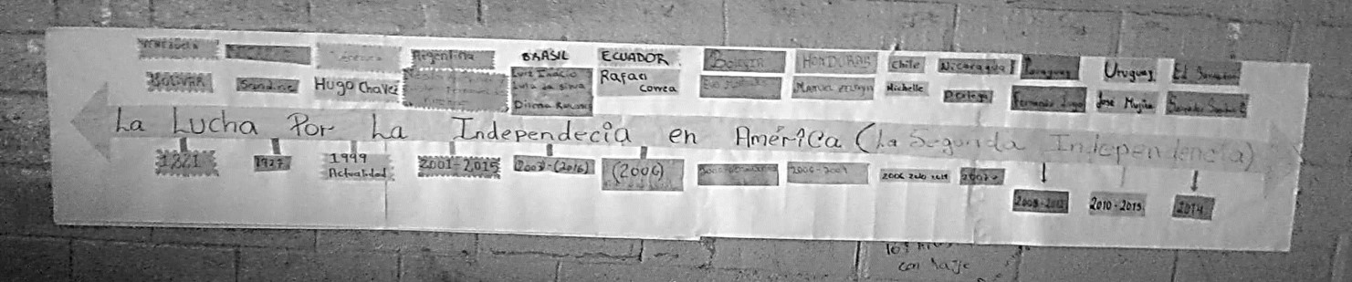 En el caso de la línea de tiempo que se muestra en la Figura 5, esta se realizó en la asignatura Historia con estudiantes de 8vo grado, en donde se hizo una recapitulación de la lucha independentista latinoamericana (desde Bolívar hasta nuestros días). La actividad se realizó de manera cooperativa entre todo el estudiantado y se construyó una sola línea de tiempo que se colocó al fondo del aula. La actividad finalizó con la presentación de la línea de tiempo siendo dirigida por el propio estudiantado de manera participativa.