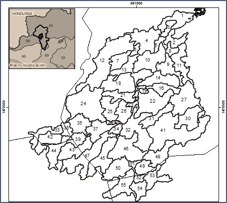 Se ha establecido que los impactos observables se dan en cuencas con tamaños entre los 0.1 a 100 km2 (FAO, 2005), tomando en cuenta esto, la microcuenca se dividió en 55 unidades de respuestas hidrológicas (HRUs) (Figura 1) sobre las cuales se ha estimado el balance hídrico, producción de sedimentos, caudales y escorrentía.