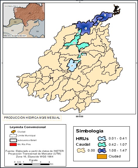 The Pire river microbasin is located in the Central American dry corridor, belonging to one of the twelve subbasins of the municipality of Condega. The area under study has an area of 109 km2 and houses about 8,900 inhabitants; it is considered as the most densely populated area in the municipality. 70% of the territory in the micro-basin has a forest vocation and the remaining 30% corresponds to agriculture. In 2015, the Nicaraguan Institute for Territorial Studies (INETER) shows that thickets represent 50% of the total territory, grasslands (37.6%), annual cultivation (7.43%), latifoliate forest (4.7%) and populated center (0.27%), showing that the soils are not being used according to their vocation. To assess the influence of land use on surface water hydrological dynamics, the water and soil assessment tool (SWAT) was used; developed and tested by the ARS (USDA) for hydrological simulation and prediction of soil-related processes; 55 hydrological response units (HURs) were obtained on which water production, sediments, overflow were estimated. The highest generation HURs of sediments and overflow are located in Ultisol soils covered by thickets on slopes greater than 500 meters.
