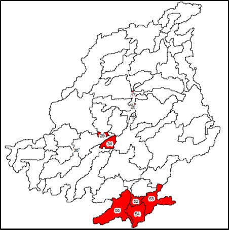 Parte Alta: áreas que se encuentran por encima de los 700 metros de altura: (HURs: 54, 55, 52, 53, 29,34), incluyendo las HURs críticas