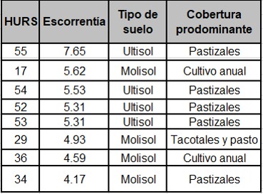 En la figura 3 y tabla 1, se muestran espacial y numérica las HURs que generan los mayores volúmenes de escorrentía, que se presentan en intervalos de 7.65 a 4.17 mensual. Las unidades de respuesta hidrológica en su mayoría están ocupadas por orden de extensión en pastizales, tacotales/pasto y cultivos anuales, ubicadas entre alturas de 1379 a 540 metros, considerándose estas áreas la parte alta de la microcuenca.