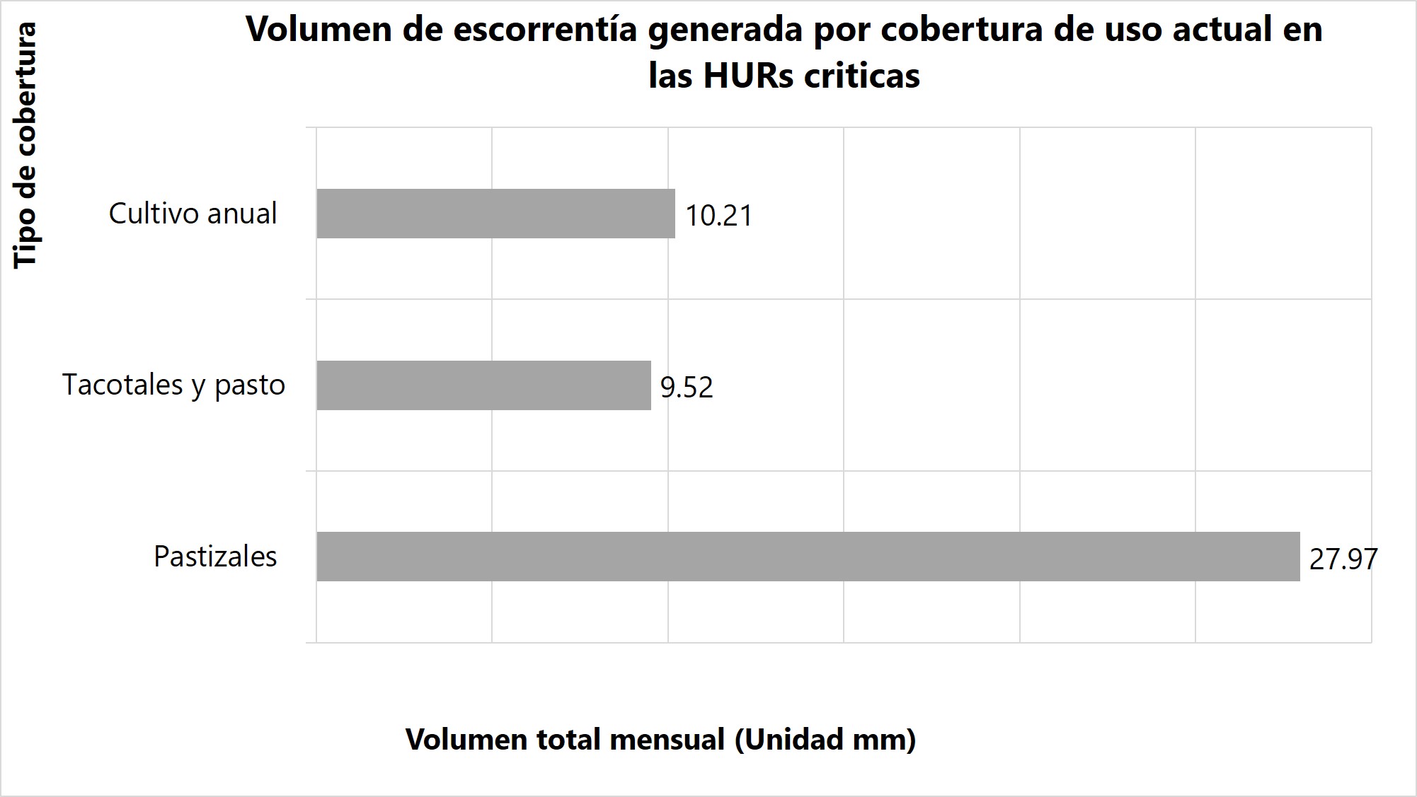 El gráfico 2, muestra que la cobertura que más favorece el proceso de escorrentía es pastizales y cultivos anuales con respecto a tacotales y pasto. Mensualmente se tiene un volumen de escorrentía de 47.7 milímetros generados por las 8 unidades de respuesta hidrológica que representan un área de 5.7 km2; la pendiente tiene un papel muy importante, de acuerdo con el coeficiente correlación de Pearson aplicado a este conjunto de datos es de 0.50 indicando una correlación