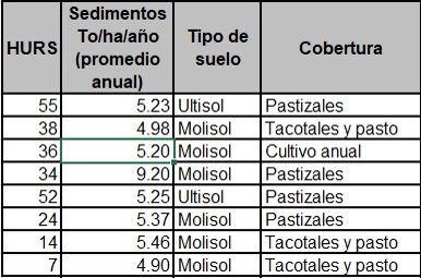 Tabla 2: HURs que generan los mayores To/ha/anual de sedimentos.