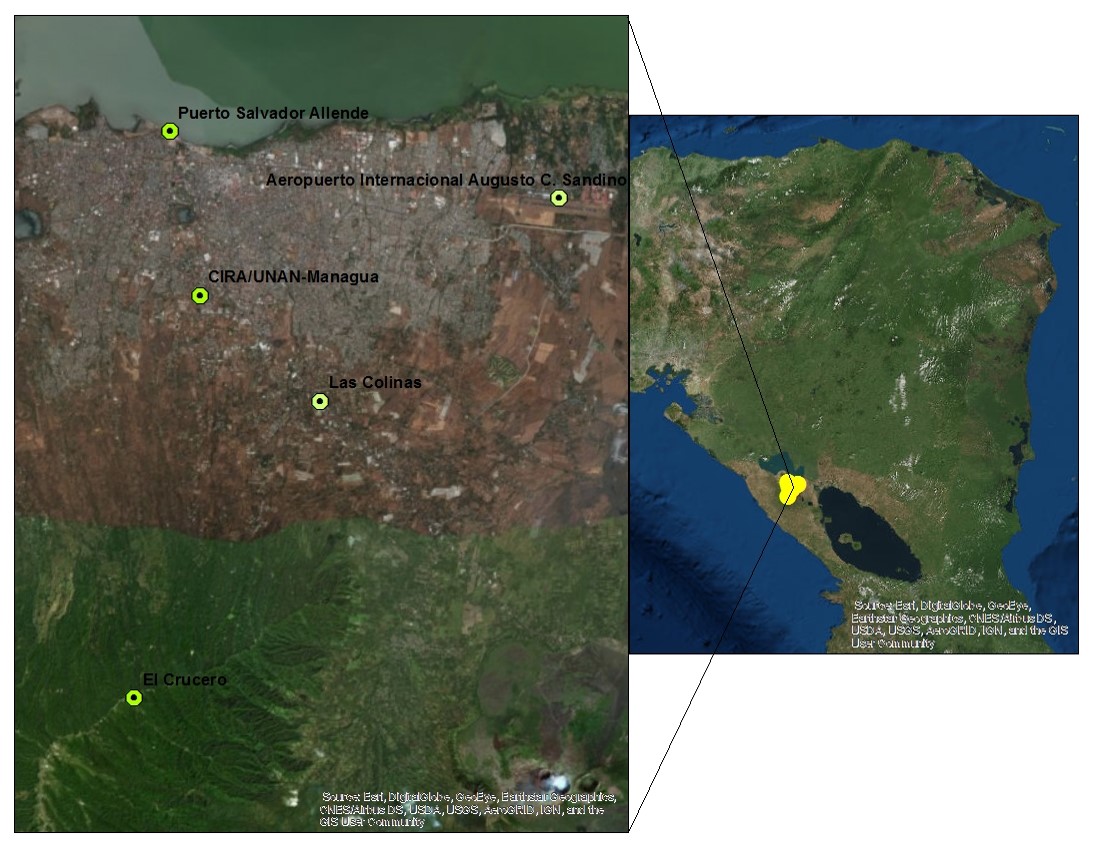 Los sitios para monitorear de las precipitaciones dentro de la ciudad de Managua (Ver Figura 1), fueron al noroeste en las costas del lago Xolotlán en el sitio Puerto Salvador Allende (PSA) con coordenadas UTM 16 P 578885 E, 1344592 N, 48 m.s.n.m. , al noreste en Aeropuerto Internacional Augusto C. Sandino (AIACS) con coordenadas UTM 16 P 590517 E, 1342580 N, 64 m.s.n.m., al sur en Las Colinas con coordenadas UTM 16 P 583388 E, 1342580 N, 261 m.s.n.m., y oeste en Centro para la Investigación en Recursos Acuáticos de Nicaragua (CIRA/UNAN-Managua) con coordenadas 16 P 579778 E, 1339663 N, 115 m.s.n.m.), estos sitios se ubican dentro de la ciudad de Managua. También se ubicó un punto de monitoreo en la comunidad Las Nubes perteneciente a El Crucero coordenadas UTM 16 P 577822 E, 1327589 N, 941 m.s.n.m.