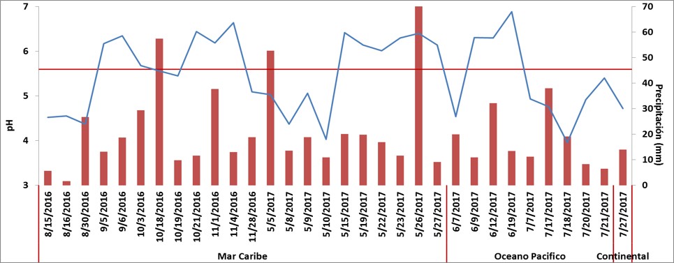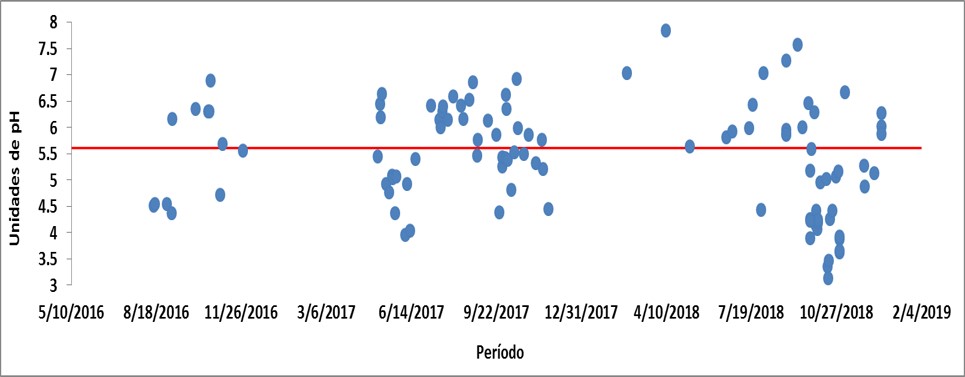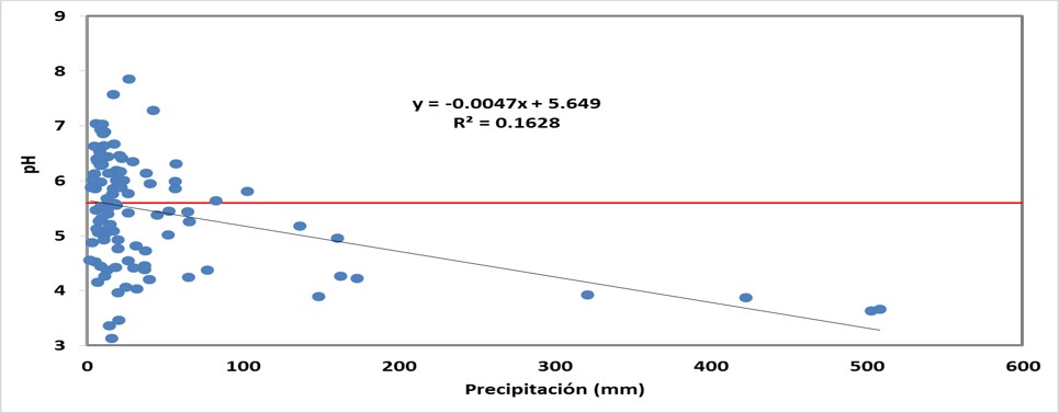 Figura 3. Correlación de pH y precipitación (mm), línea roja representa el equilibrio de pH (5.6), los datos corresponden al período 2016-2019.