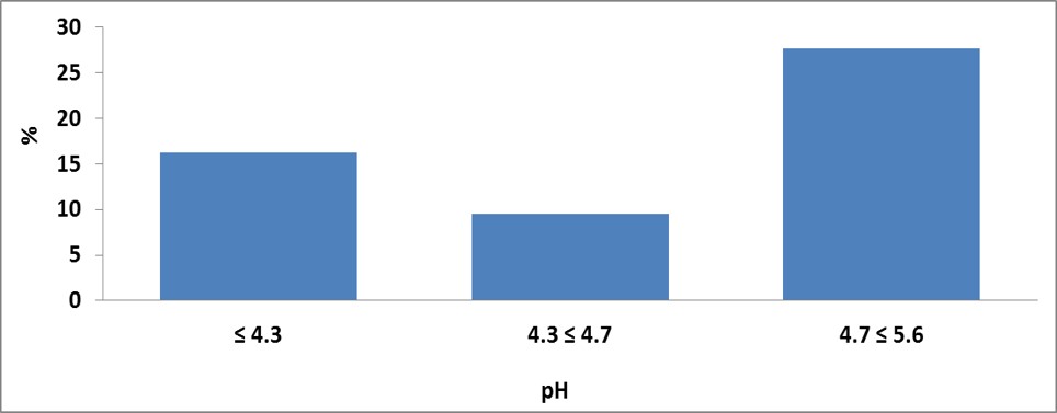Considerando el valor de 5.6 como equilibrio de acidez de las precipitaciones, donde los valores superiores son considerados como lluvia natural e inferiores son consideradas como lluvias acidas. El 51% corresponde a lluvias ácidas y 49% a lluvias naturales (Ver Figura 2 b). Clasificando los eventos de lluvias ácidas se obtuve que lluvias ligeramente ácidas con pH entre 4.7 y 5.6 con 29 eventos, lluvias ligeramente ácidas con pH entre 4.3 y 4.7 con 10 eventos y lluvias fuertemente ácidas pH inferior a 4.3 con 17 eventos de precipitación.