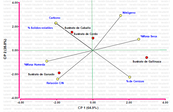 Tal como se observa en la figura 1, según la proximidad el sustrato de caballo está más asociado al carbono y % de solidos volátiles. Entre nitrógeno y % de masa seca hay un ángulo menor a 90 grados lo que significa una fuerte correlación entre ellos, existe una leve correlación entre % de masa seca y % de cenizas, leve correlación entre % de masa húmeda y relación C/N, leve correlación entre % de masa seca y % masa de solidos volátiles, así mismo se observa una correlación inversa entre % masa seca y % de masa húmeda, es decir cuando una de estas variables aumenta la otra disminuye y viceversa.