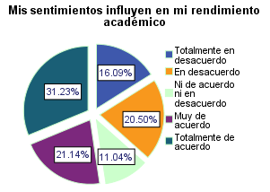 Reconocer las propias emociones y sentimientos, así como sus efectos es parte de la consciencia emocional, la mayoría de los estudiantes reconocen emociones relacionadas al rendimiento académico el 31.23% y el 21.14% se encuentran totalmente de acuerdo y muy de acuerdo respectivamente (Figura 3).
